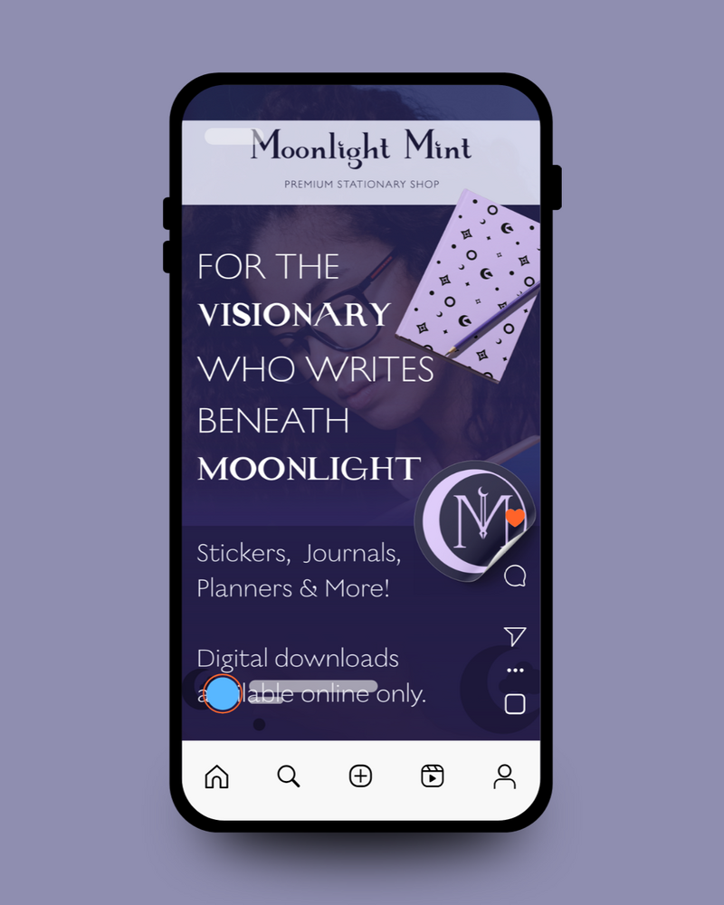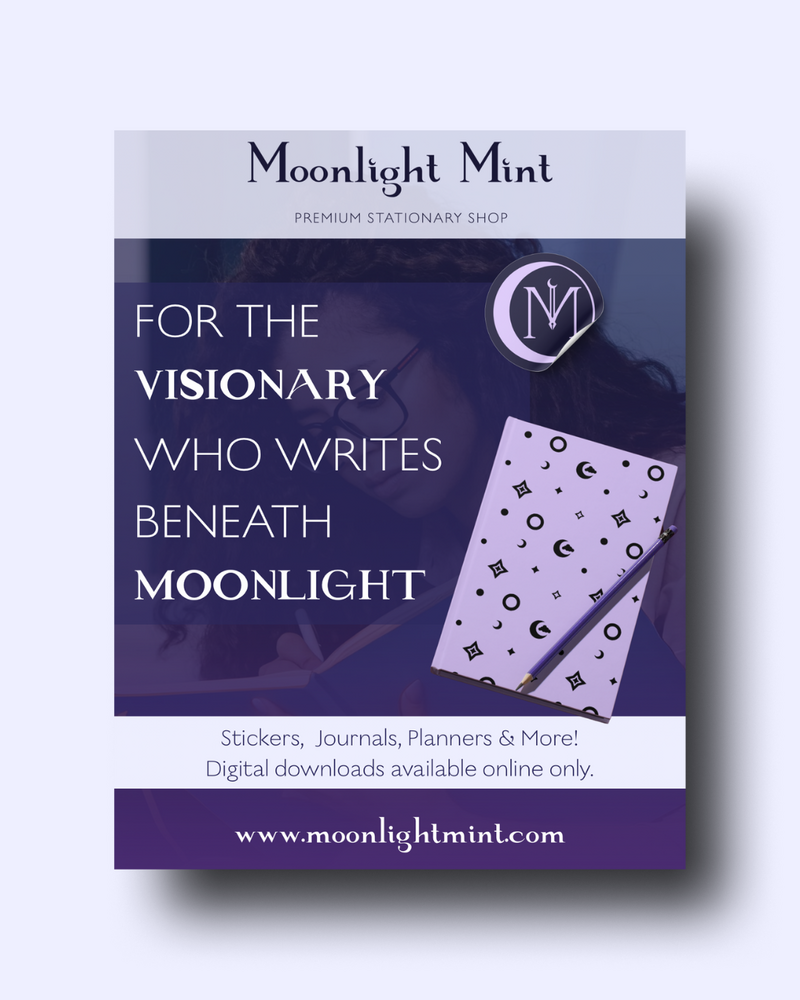 If you've ever had a favorite pen or notebook/journal, then you definitely understand the concept behind Moonlight Mint! This brand was made to be for the nighttime creative, the writer who randomly wakes up at 2AM because they had a dream about how to finish the chapter they've been stuck on. For those who love the feeling of pen gliding across paper like butter as they express their entire being onto the page. Those who are still in love with one of the oldest forms of modern expression. This brand was made to welcome those and help them feel seen in a comforting breath of magic, mystery and the small joys of everyday life. If you've ever bought a notebook just because you loved the design of it, this is for you.